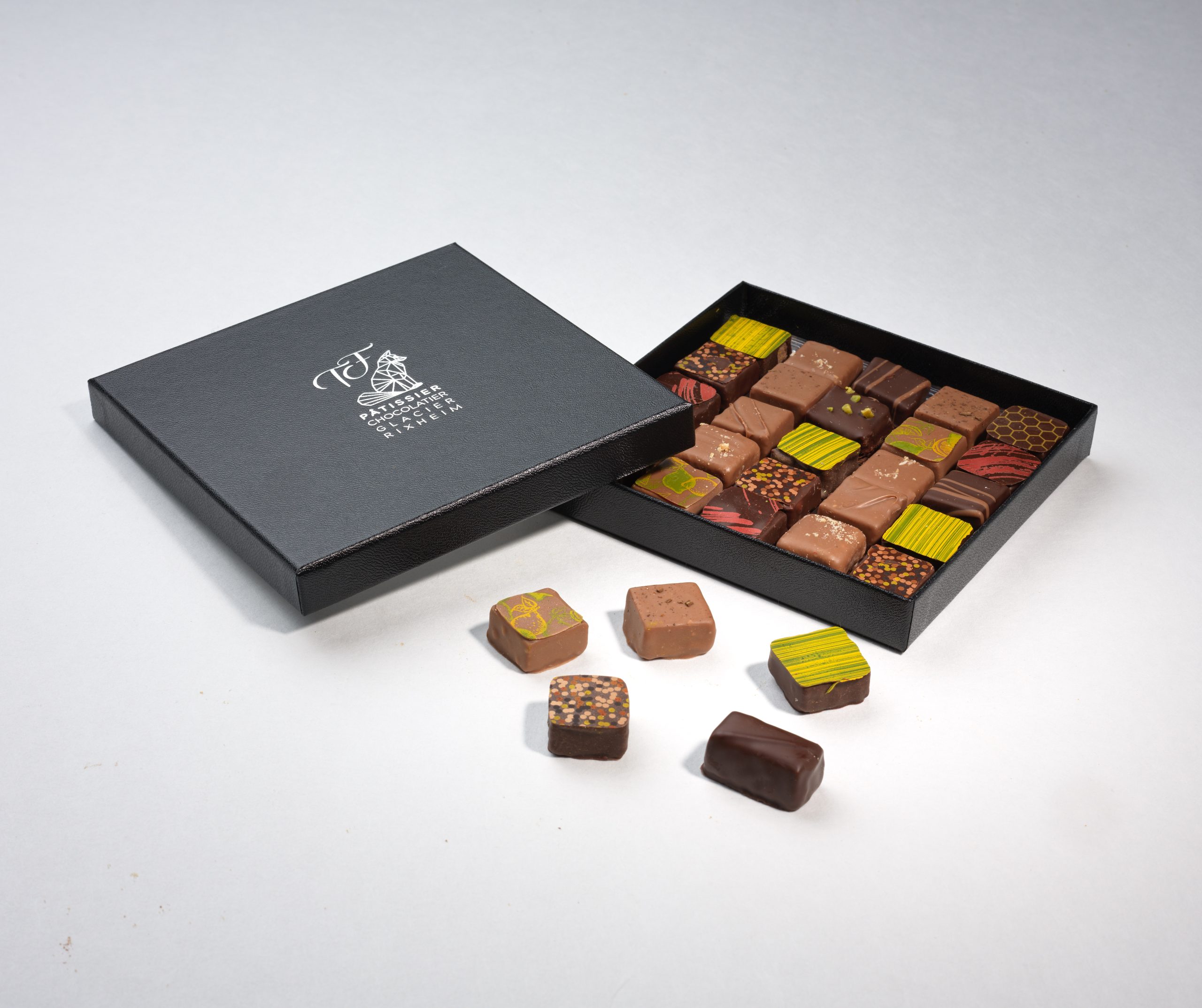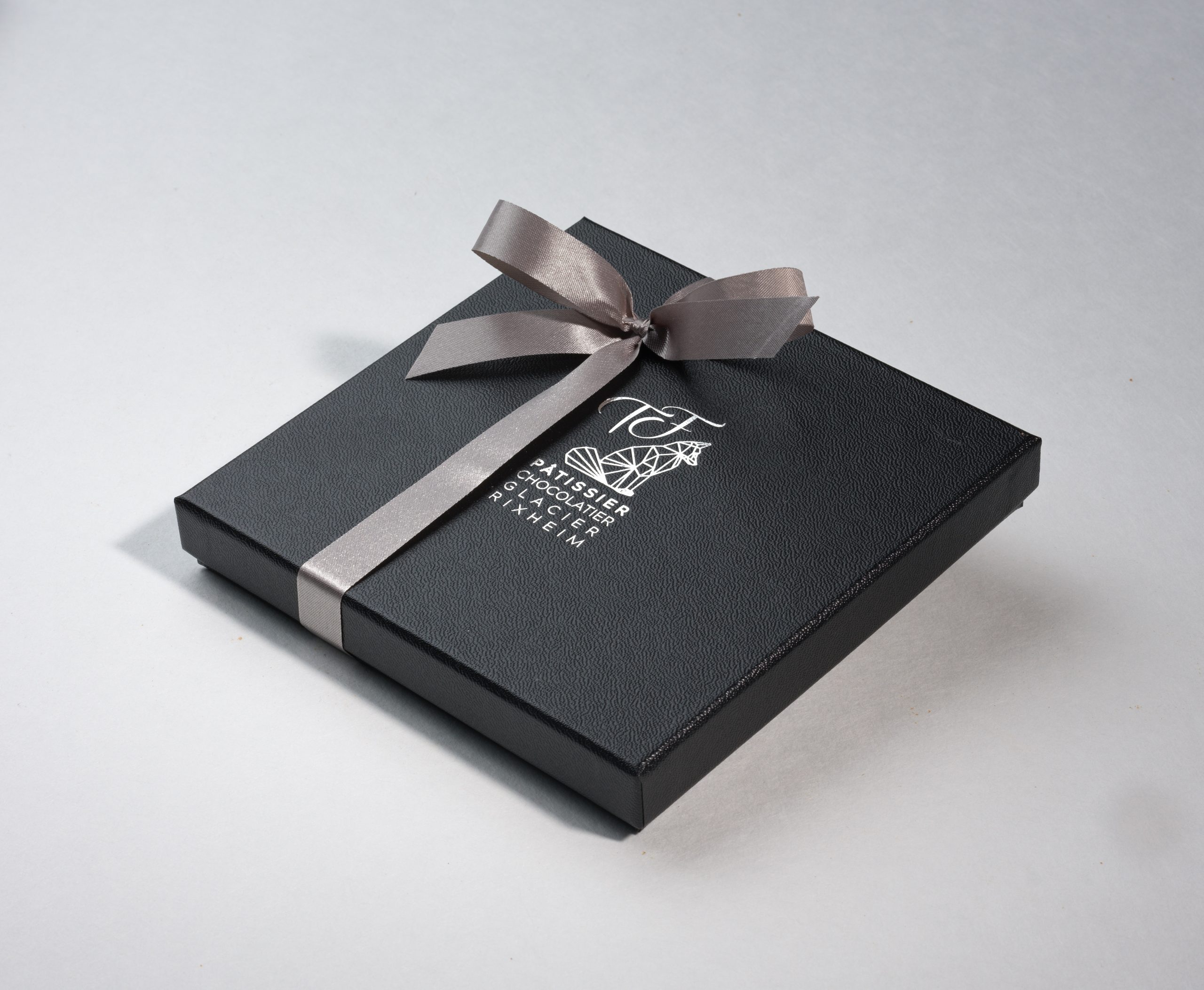Praliné noisette 66% – praliné amande 66% – vanille – thé (vert et rouge) – sucre – sucre inverti – sorbitol – feuillantine – beurre de cacao – glucose – crème – lait – chocolat lait / noir / blanc – café – pâte d’amande 70% – fleur d’oranger – pulpe framboise – pulpe fruit de la passion – pulpe mangue – violette – cerise – kirsch – cointreau – cacahuète – fleur de sel – poudre de coco – pistache