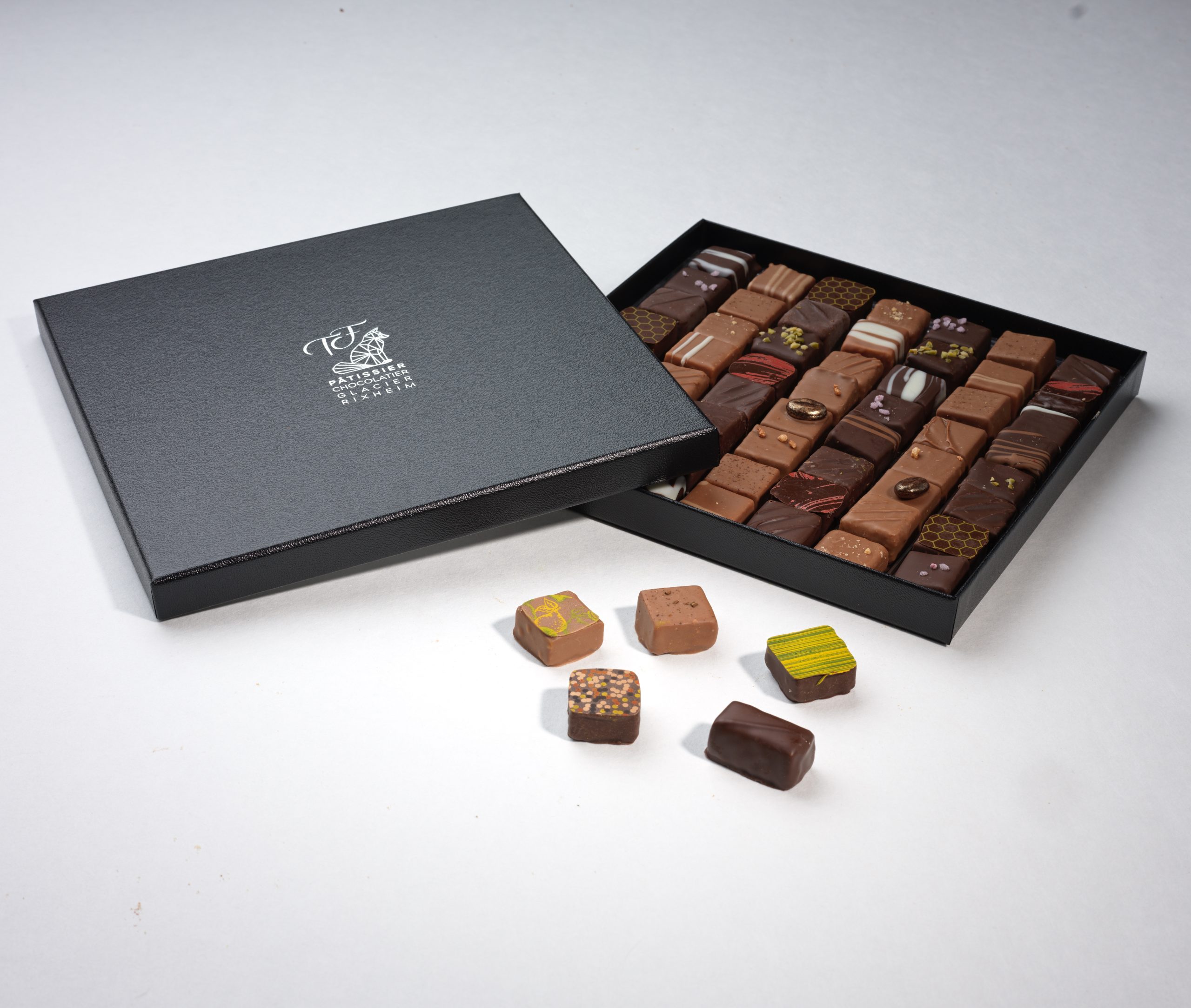 Praliné noisette 66% – praliné amande 66% – vanille – thé (vert et rouge) – sucre – sucre inverti – sorbitol – feuillantine – beurre de cacao – glucose – crème – lait – chocolat lait / noir / blanc – café – pâte d’amande 70% – fleur d’oranger – pulpe framboise – pulpe fruit de la passion – pulpe mangue – violette – cerise – kirsch – cointreau – cacahuète – fleur de sel – poudre de coco – pistache