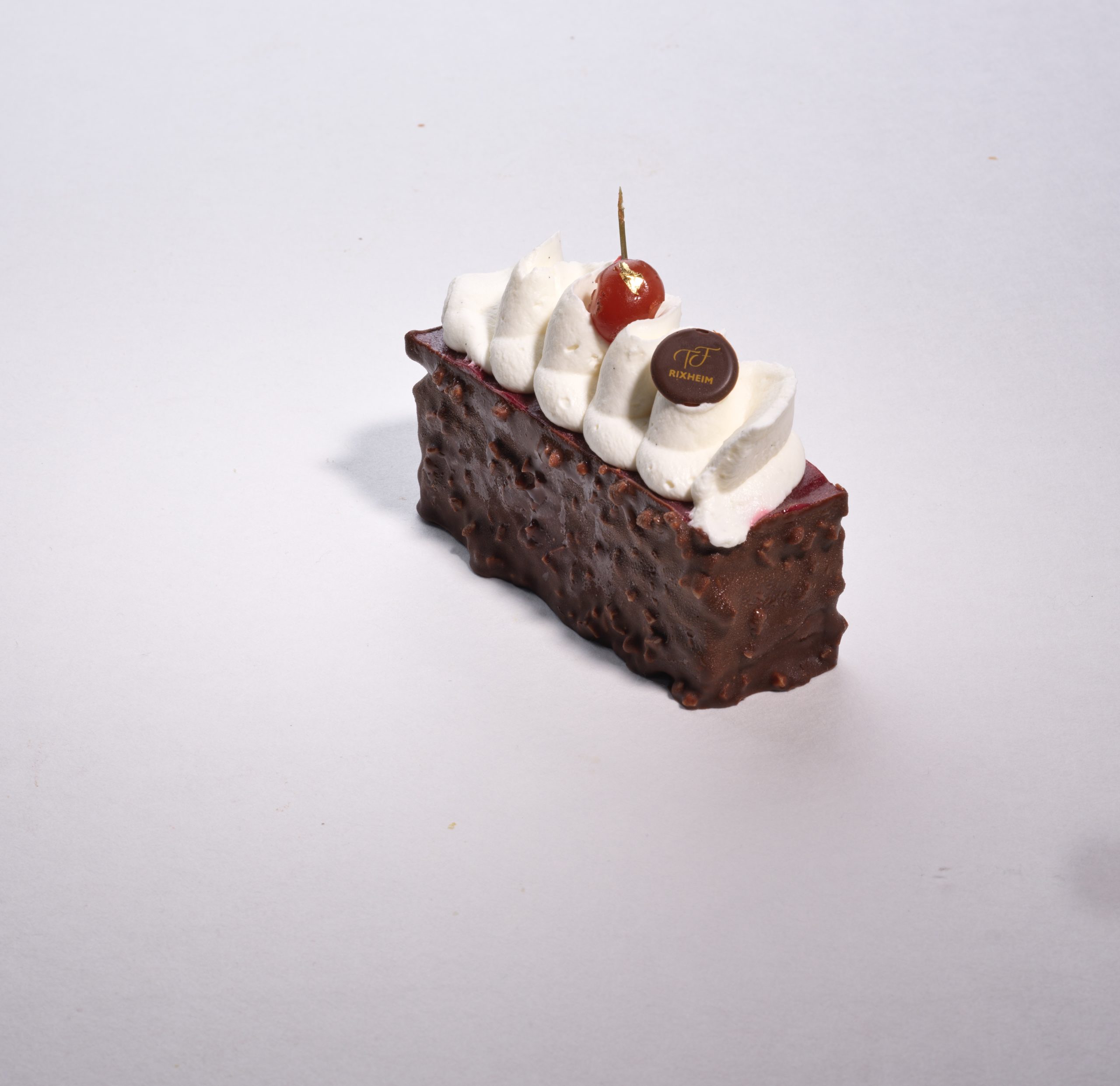 Biscuit au chocolat sans farine, mousse chocolat lait 40% , cerises au kirsch d’Alsace, gélifié à la griotte, ganache montée vanille de Madagascar au kirsch d’Alsace, glaçage roché chocolat noir 61%
