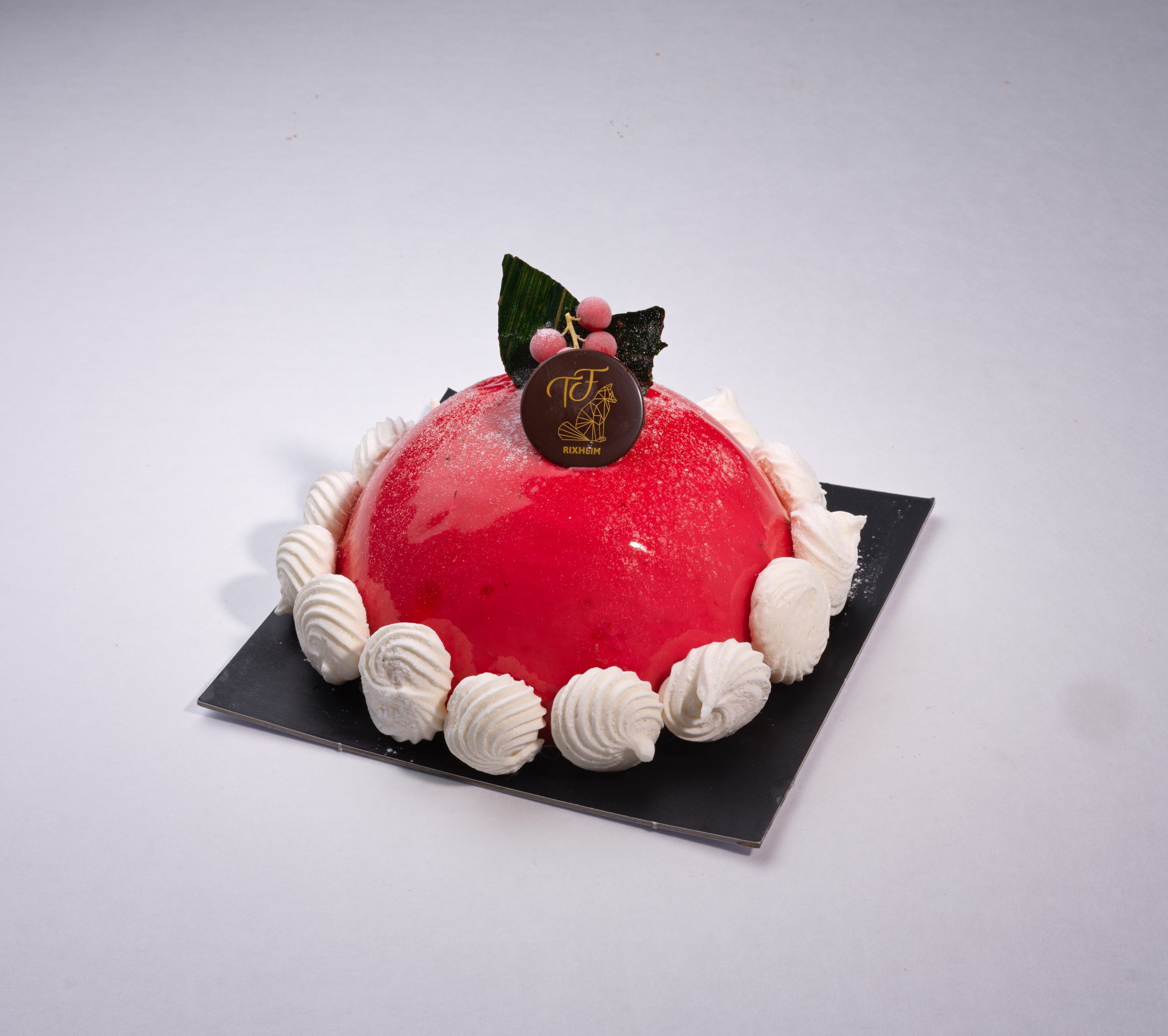 Sorbet griotte , parfait glacé chocolat Caraïbes66% , fond de meringue aux amandes, glaçage à la griotte , meringuettes en décors