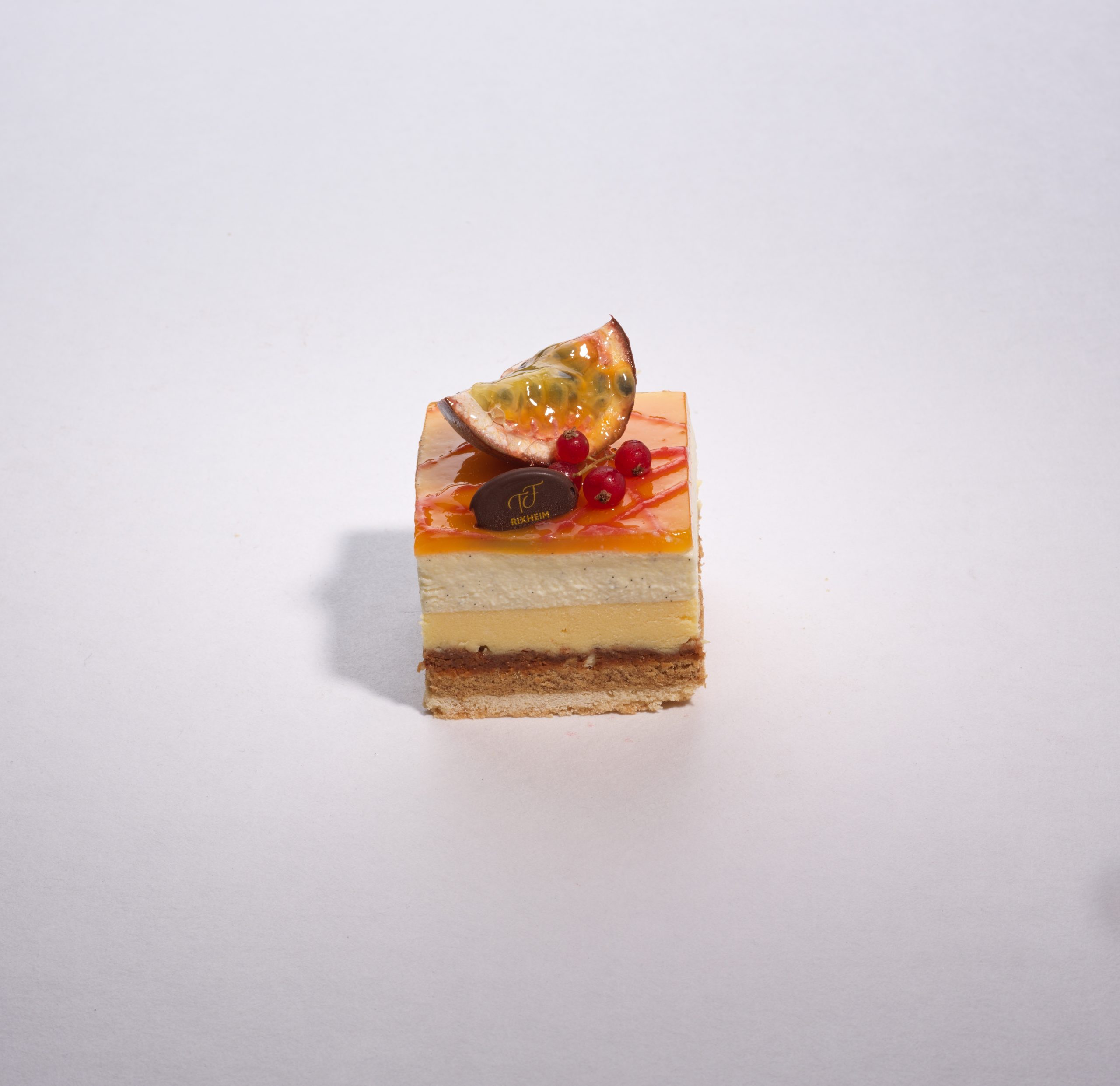 Fond de pâte sucrée, biscuit praliné amande, croustillant praliné amandes, crèmeux fruit de la passion, bavaroise vanille de Madagascar, gélifié fruit de la passion