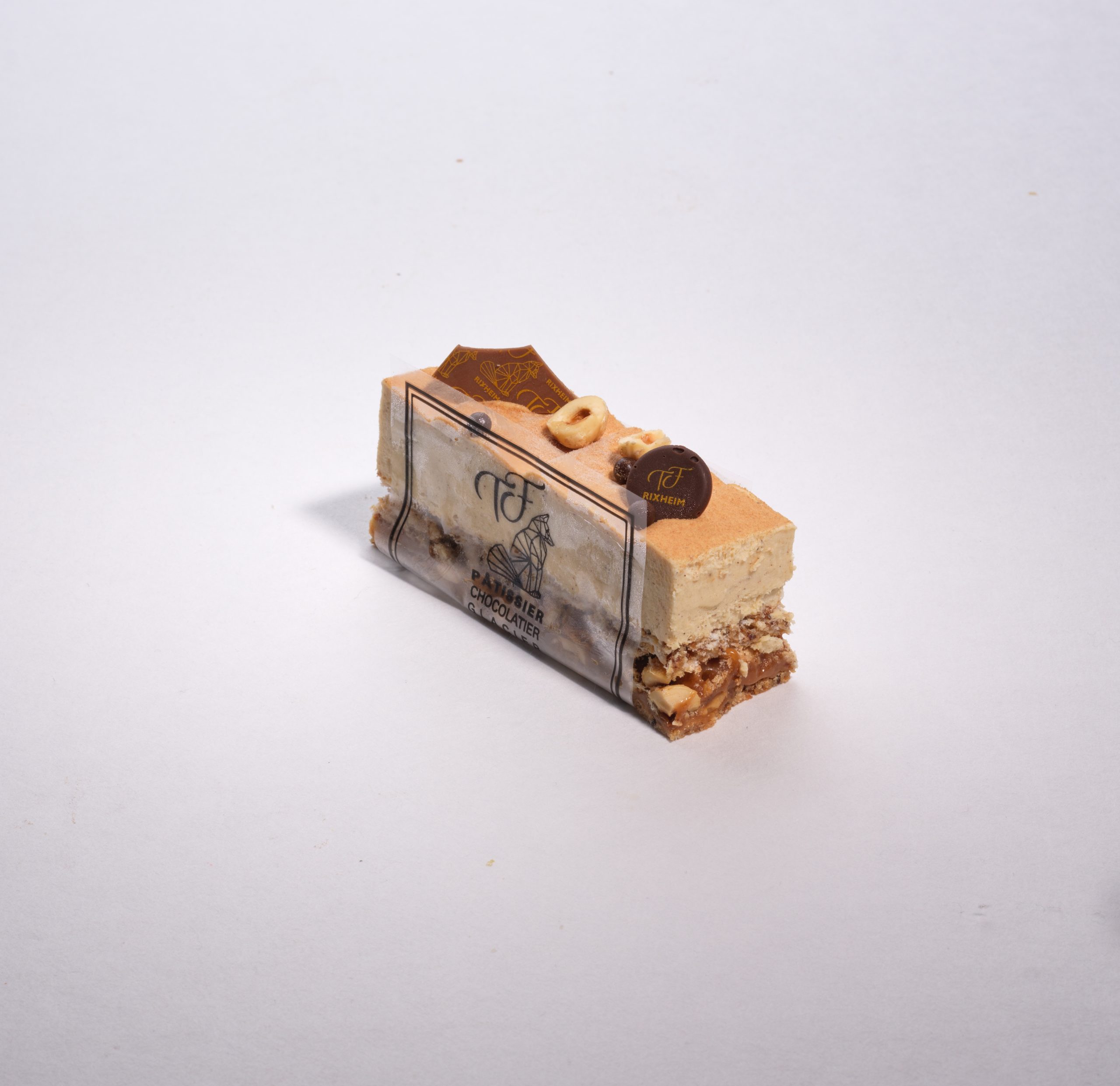 Biscuit dacquoise aux noisettes, caramel fleur de sel et chocolat au lait, mousse légère au praliné noisette