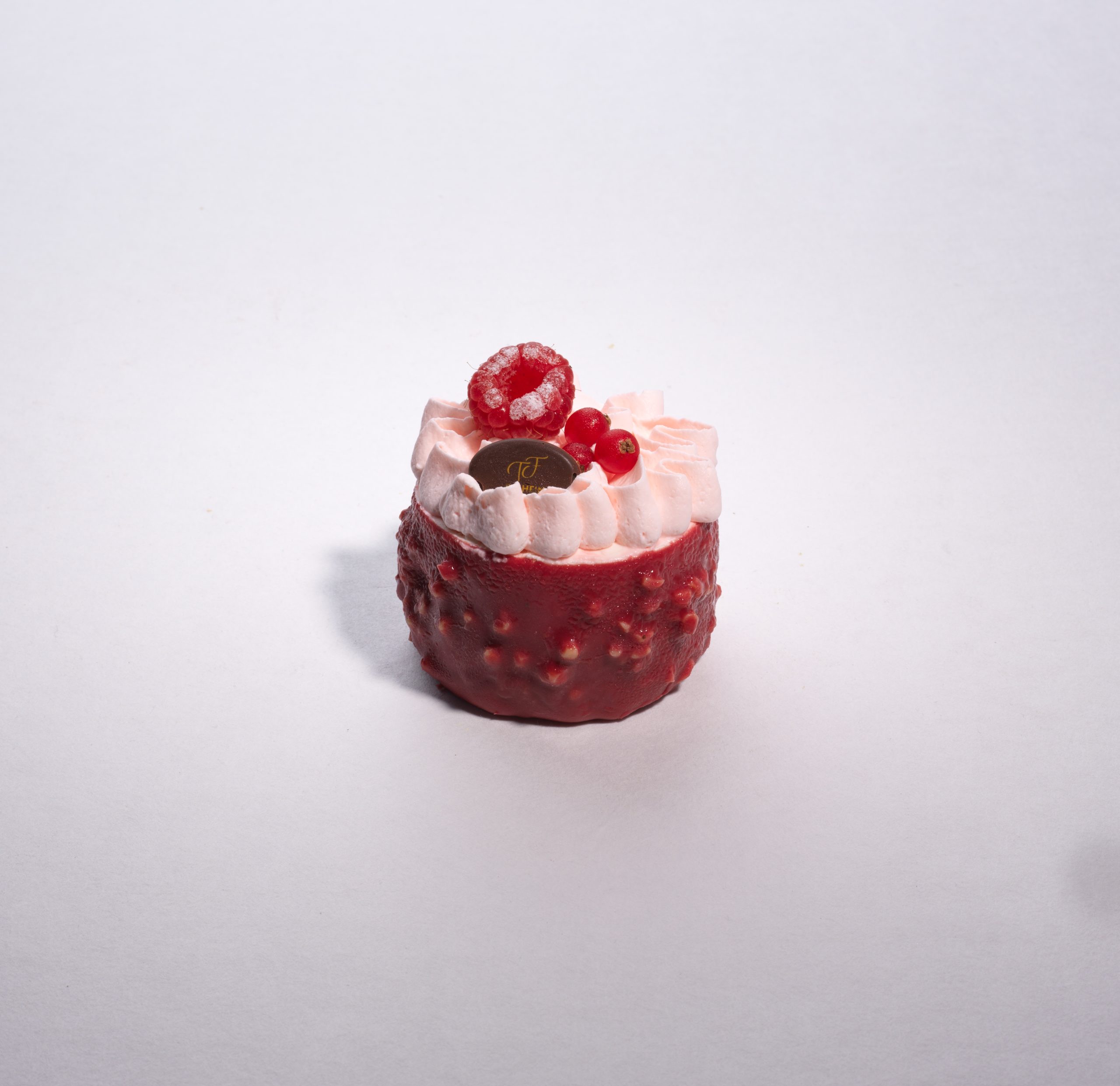 Biscuits cake imbibé kalamansi, compotée fraise des bois, ganache montée fèves de tonka, glacage rocher framboise, ganache montée fraise Mara des bois